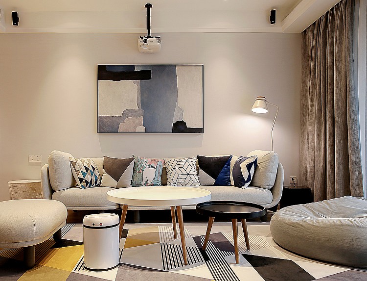 客厅区域「立体式环绕音响」「投影仪」「造作云团沙发」搭配墙面浅灰色的墙面非常舒适宁静,抱枕的湖蓝色挂画的颜色都能融入到整体空间,地毯的黄色条纹能够和入户的谷仓门黄色相互匹配,整体贯穿整个空间