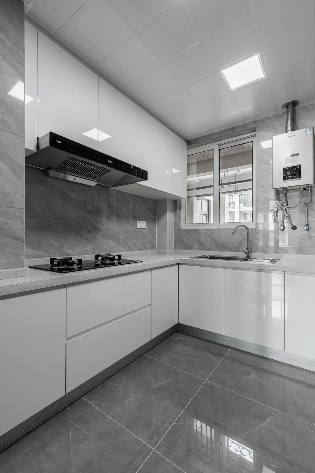 厨房以亮光的灰色地砖与墙砖基础,装上白色的橱柜吊柜,L型的操作台,简洁明亮的空间,带来了一个舒适现代的烹饪氛围。
