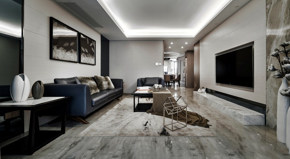 客厅采用爵士白的大理石、灰镜、硬包、饰面板等简约风的元素打造了一个比较高冷的客厅。建筑本身的2.8米层高不算很高,所以没有采用全吊顶,而是为了隐藏中央空调的水管做了局部吊顶。