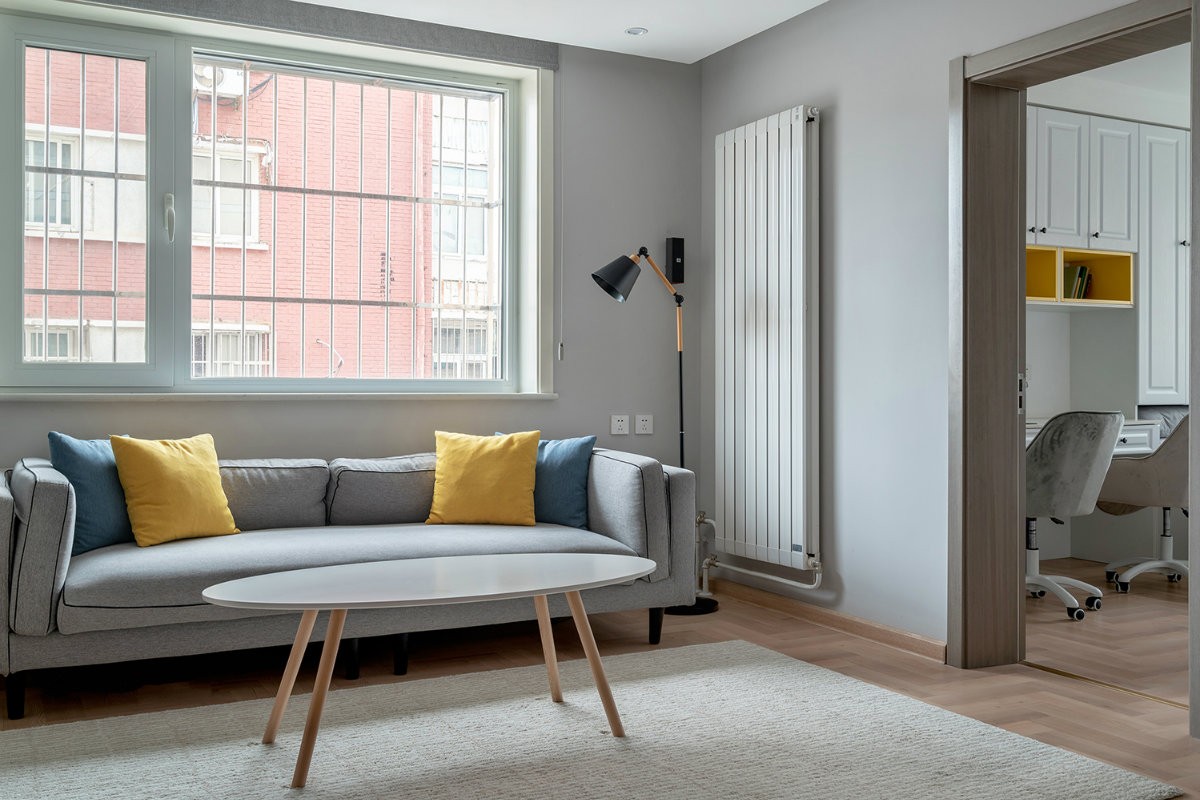 整体材质以白色为主,黄色的套格做了一些跳色。双人位的书桌足够满足男女屋主同时办公的需求。