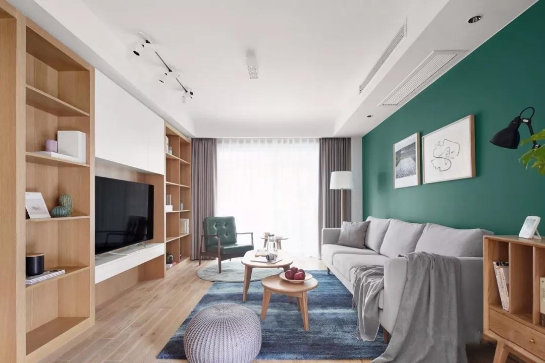 电视背景墙也做了整面的定制落地柜,原木色搭配复古绿,加以白色的基调,使这个空间简约又不失设计感。