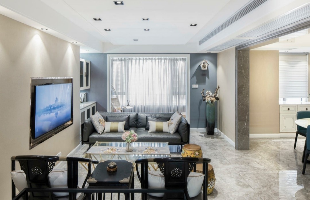 客厅更偏向于沉稳,皮质的沙发与中式椅子组合的搭配独具特色、两个中式黄色鼓凳成为客厅的亮点。