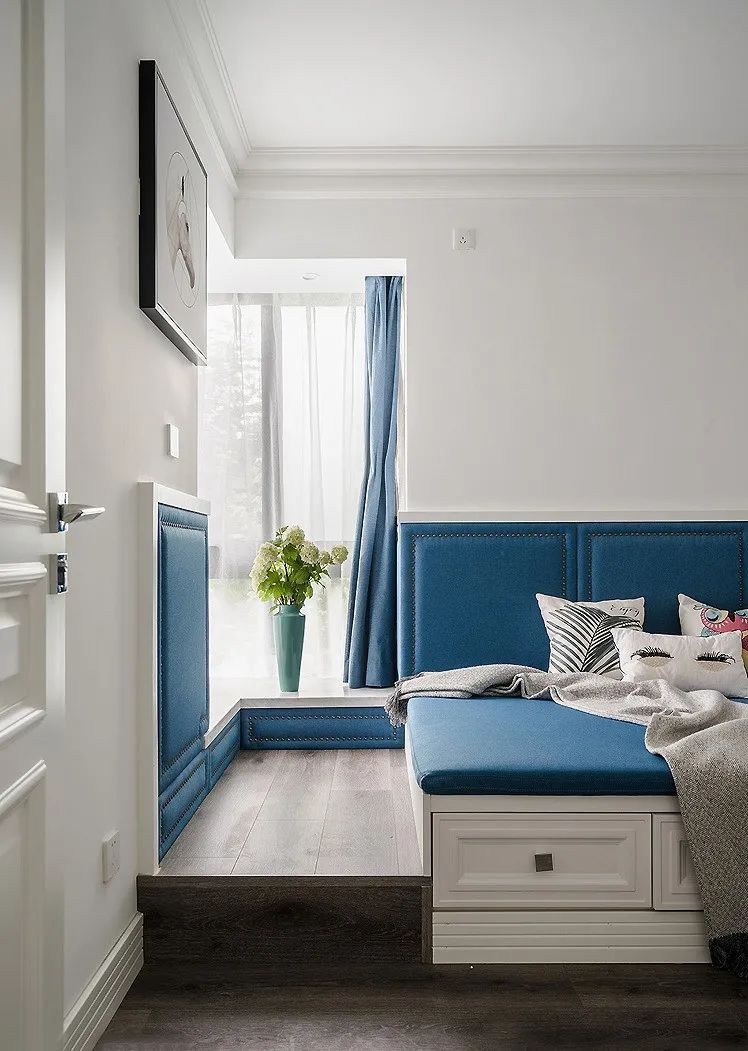 榻榻米下面设计了4个大抽屉,日常居住使用起来非常顺手方便。L型的飘窗特地做了高地台设计,非常休闲。