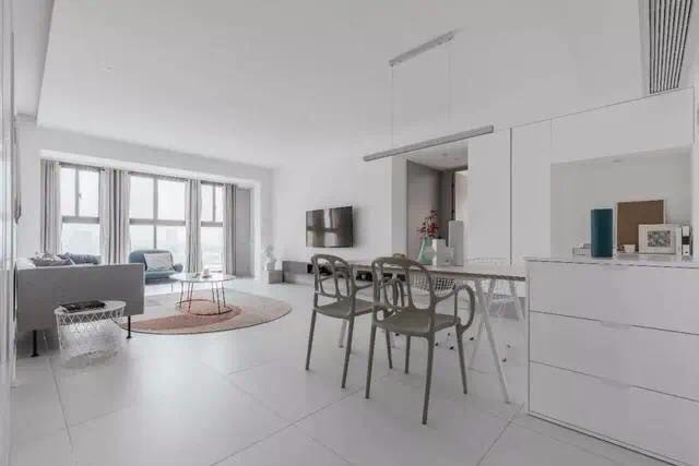 客餐厅没有增加隔断分割,整体比较通透明亮。浅灰色的地砖搭配白色的墙面,给人一种轻松自在的感觉