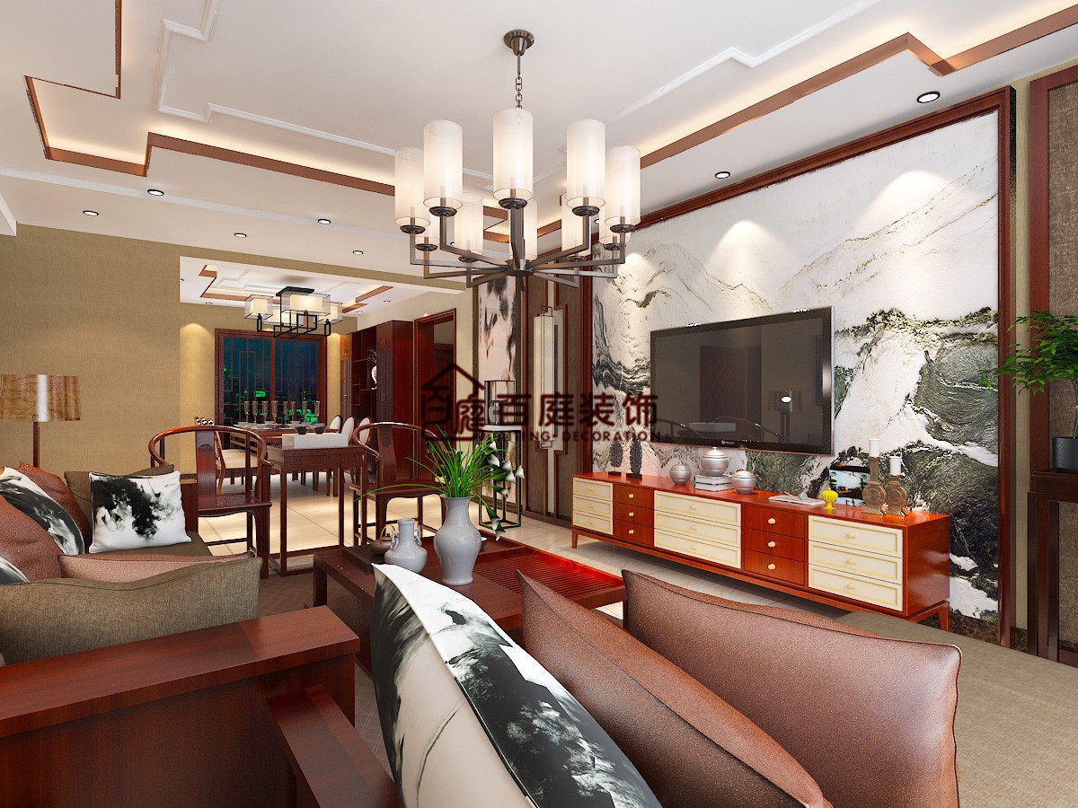 用山水背景墙让意境游离在环境的享受之中用灯光的承托将室内温度调整适中