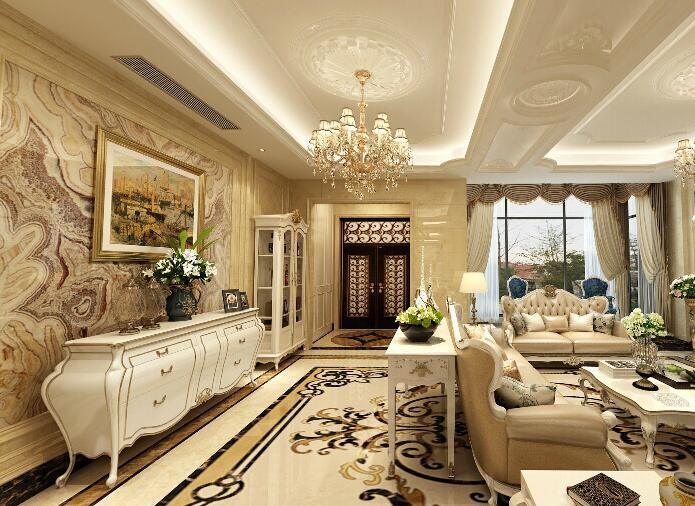 欧式风格形式上以浪漫主义为基础,装修材料常用大理石、多彩的织物、精美的地毯,精致的法国壁挂