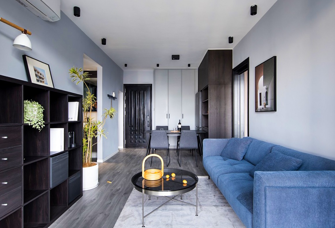 灰蓝色的沙发,一个随意躺下的沙发,非常态的模式,巧妙定义了单身人士关于随意而居的动作。
