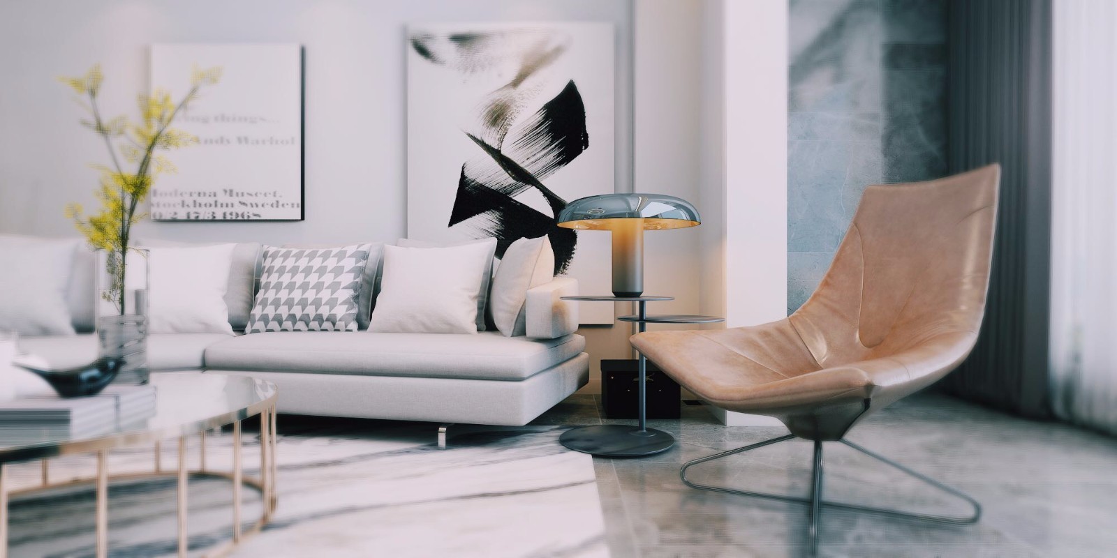绿色植物进行点缀,与白灰色的墙面更加的相得益彰。