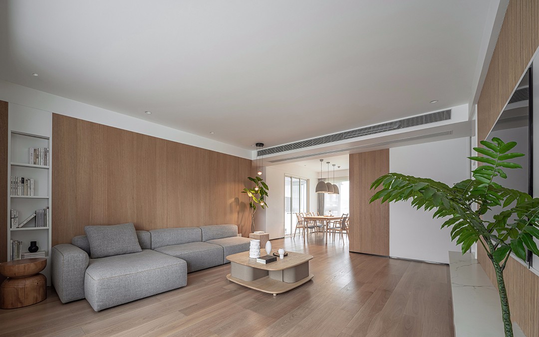 结合东方的空间规划,沙发背景运用了自然纹理的木板,保留了玄关处的神秘感,同时也隔离开入户时一眼就看穿整个空间的隐私性。
