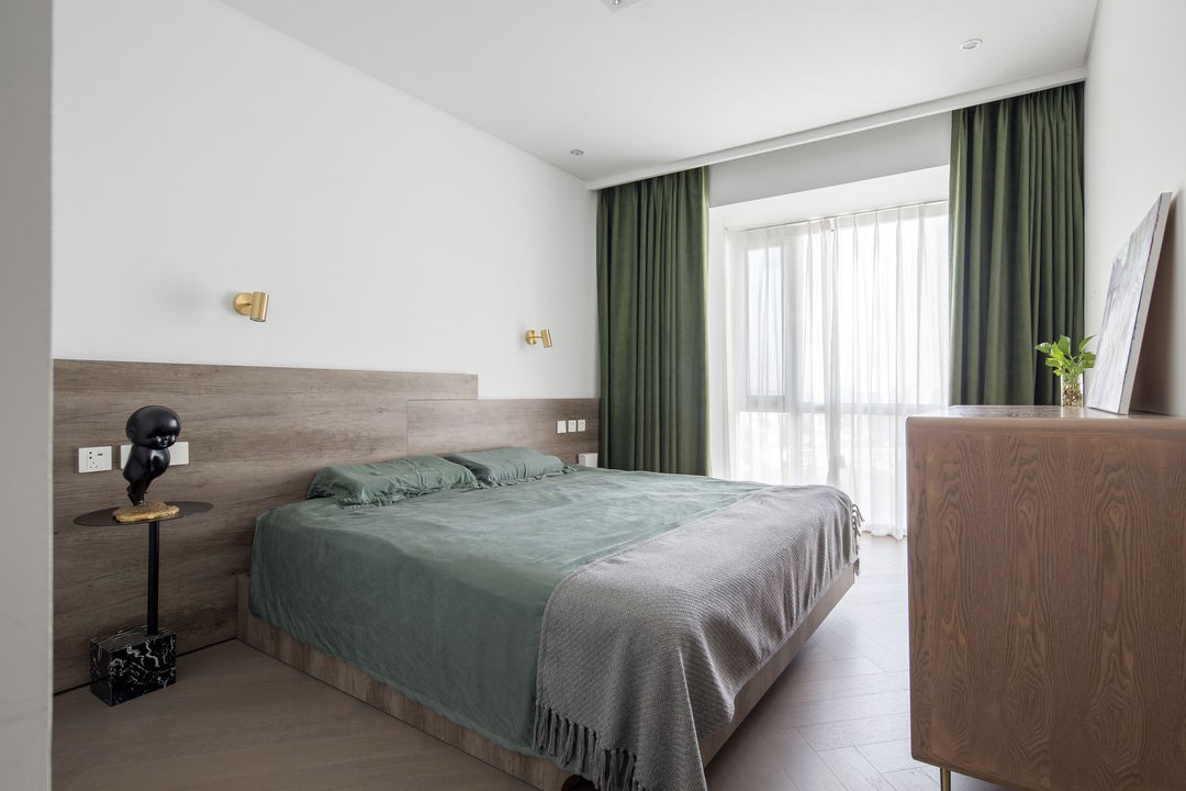 在主卧中木作覆盖了床头背景墙营造出不一样的空间氛围,浅灰色木饰面墙面搭配白色柜子。