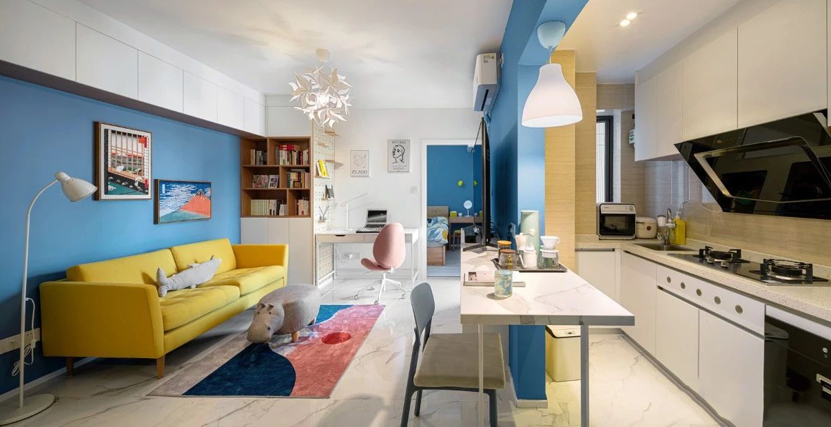 选择了明黄色的沙发与蓝色墙体达到撞色的效果,再搭配其他含有蓝、白、黄三种主色调的配饰,北欧文艺风也可以变得活泼、灵动。