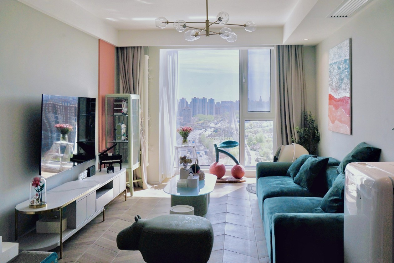本案的屋主是一个律师小姐姐,在自己25岁生日那天,她决定将这套家里预留的两室作为礼物送给了自己。这套坐落于帝都的两室,天气好的时候,可以直观三环的中国尊、北四环的鸟巢和西三环的中央电视台。所以设计师将客厅和主卧的阳台的窗户改为大片的落地窗,才不辜负这番景观。因为家里的猫咪较多,虽然空间不大,但是也希望能有一个它们能够玩乐的空间。因为工作会长期使用电脑,所以需要一个书房空间。