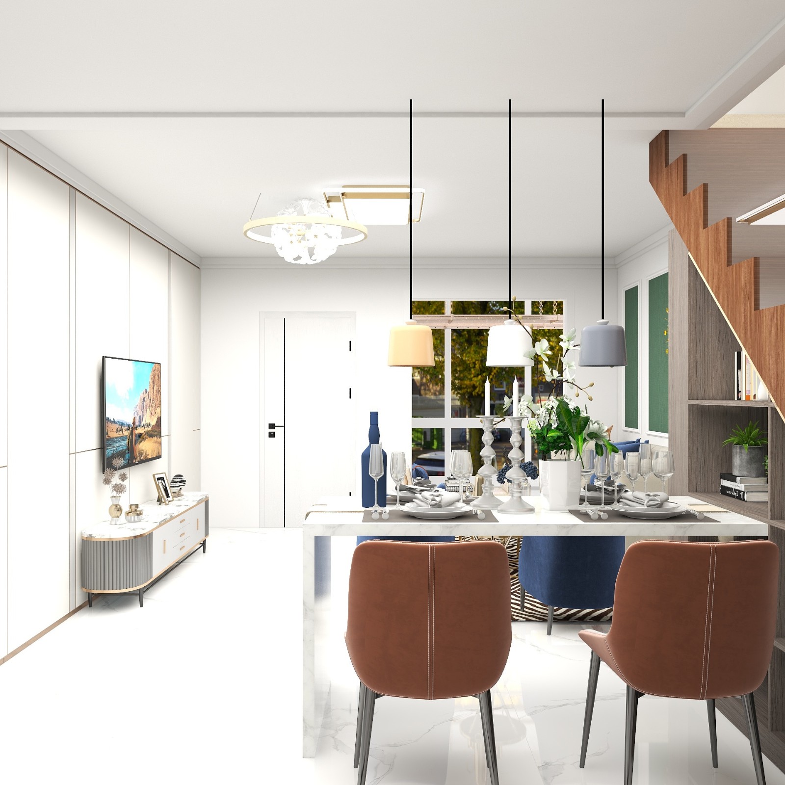 电视背景墙是隐形门,楼梯处做了吧台