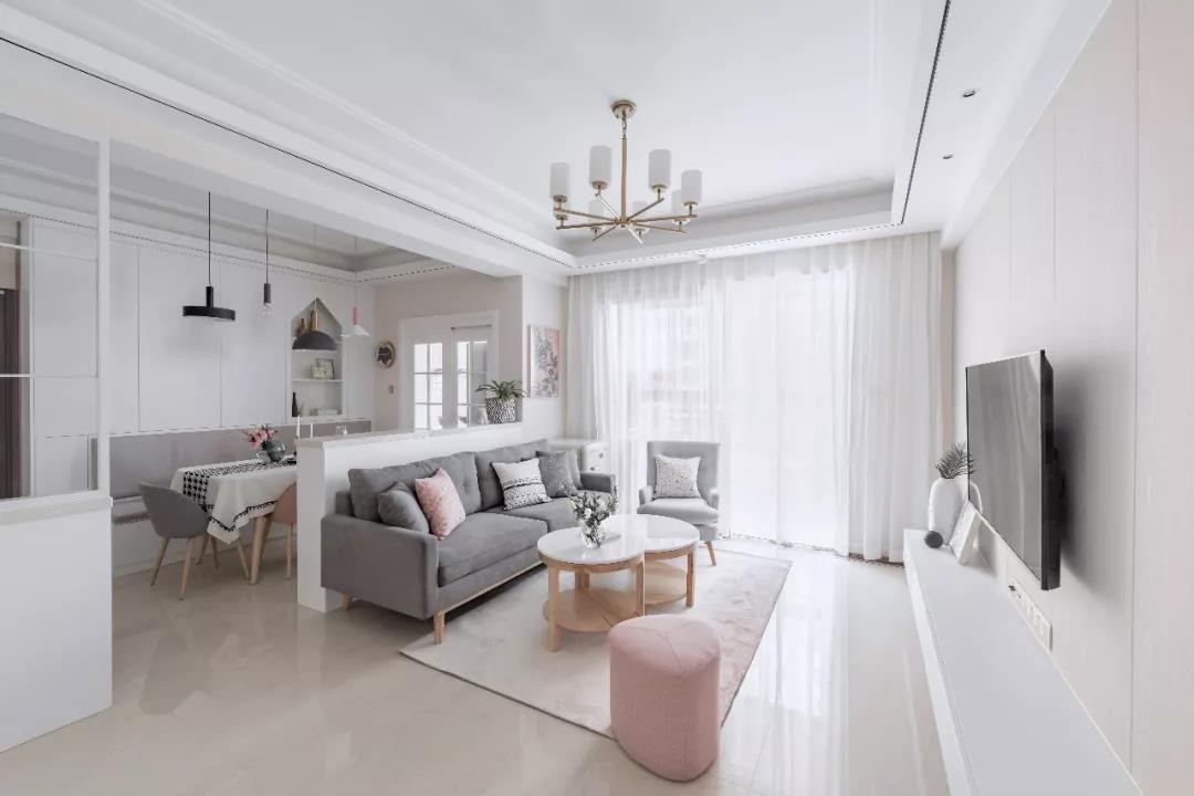 客厅以洁净的空间基础,沙发矮墙后方就是餐厅区域,整个空间简单整洁,以舒适的软装为主,营造出轻松惬意的氛围。