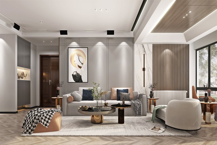 客厅吊顶以无主灯设计,辅助光源营造家庭型氛围,磁吸轨道灯结合暗装射灯照亮整个空间