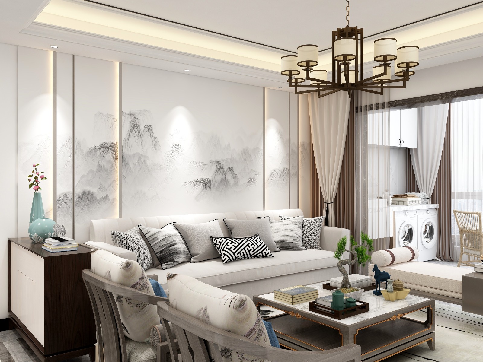 本案定义为新中式风格,木色家具的温度感,空间开阳富有生命力,功能区的合理划分,业主生活更为方便。背景墙材料的丰富性让整个空间档次有质的提高。