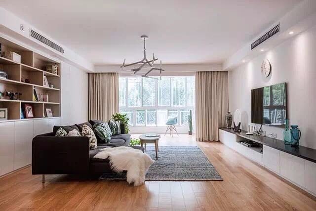 现代风格的两居室,客厅要求展示空间和储存空间,餐厅和厨房纳入一个空间,让空间更加整齐,整洁。