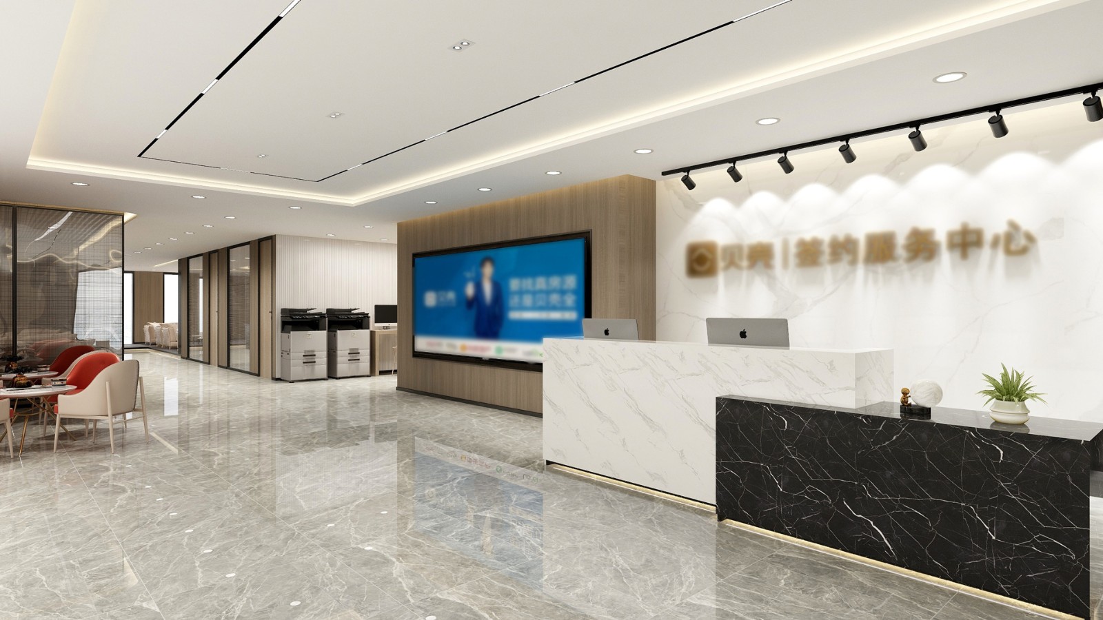 位于武汉光明中心的贝壳签约中心,地面是灰色地砖,背景墙是雅士白岩板,墙面为木饰面整铺。