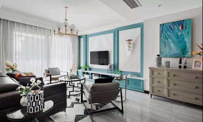 案例中多种颜色混搭运用,十分大胆,点线面方面的空间设想也十分落地,加入些许轻奢的贵气,适合美式随性大方的风格特点。