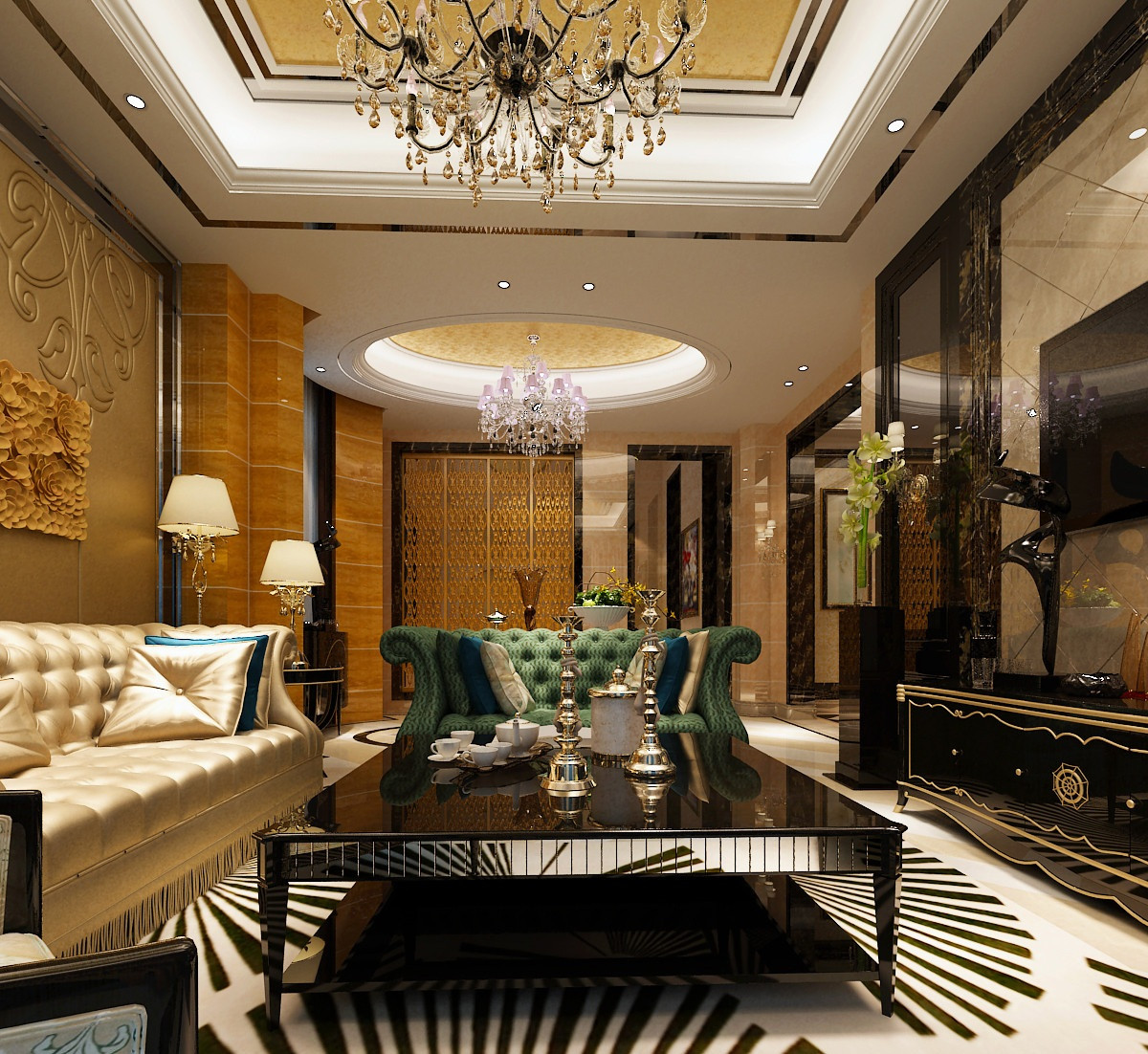 墙面为镂空金属雕花,营造奢华感