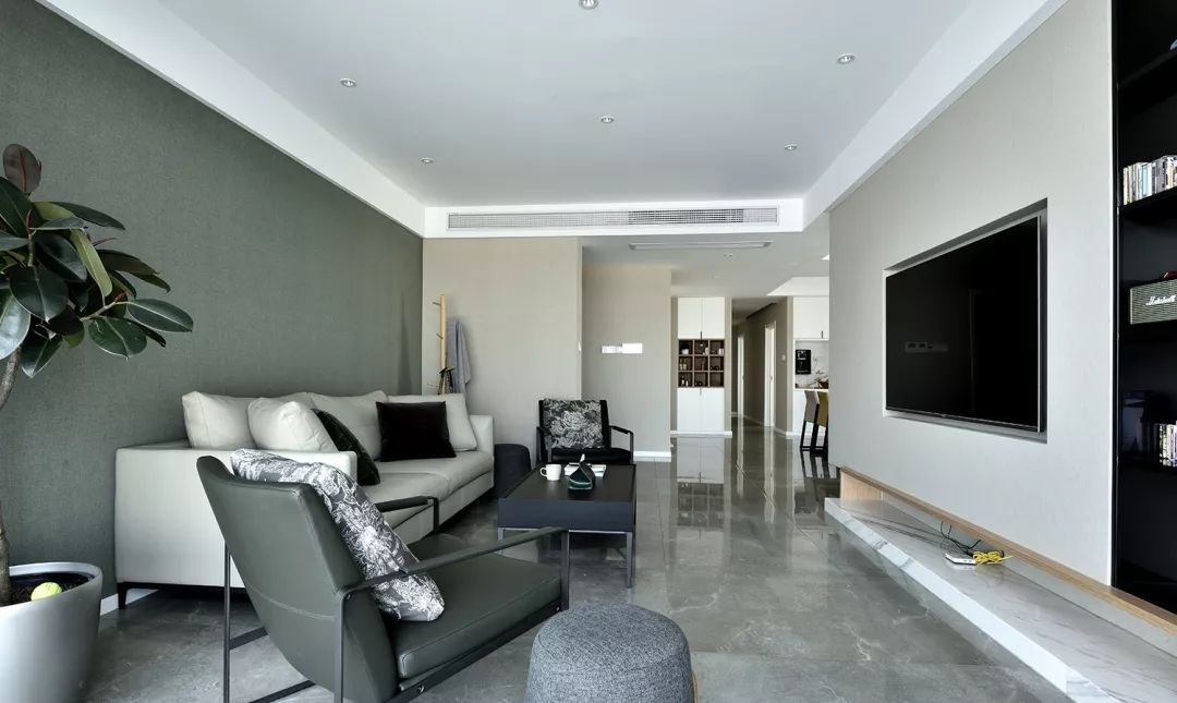 客厅的电视选择了嵌入墙内的设计,让人感觉更加简洁。底部用大理石做上一个长隔板来代替电视柜,和墙面齐平更不显突兀