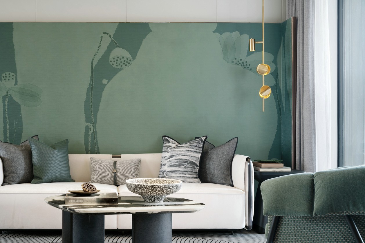 清水出芙蓉,天然去雕饰。设计师基于文艺内在联系,于空间中做美感论述与人文思考。选取墨绿与黑白线条的和谐碰撞,将荷花的千姿百态跃然于墙上,加以现代感的造型与东方特质的线条,在千变万化的组合中散发出风韵。