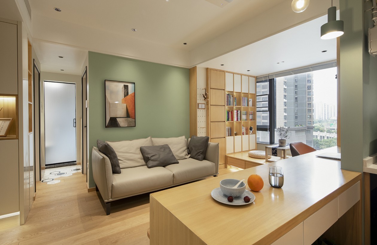 灰豆绿色的沙发背景墙在整个空间起着画龙点睛的作用,挂画靠在一边让墙体比例更加协调、舒适;木色的地板使空间更加温馨。