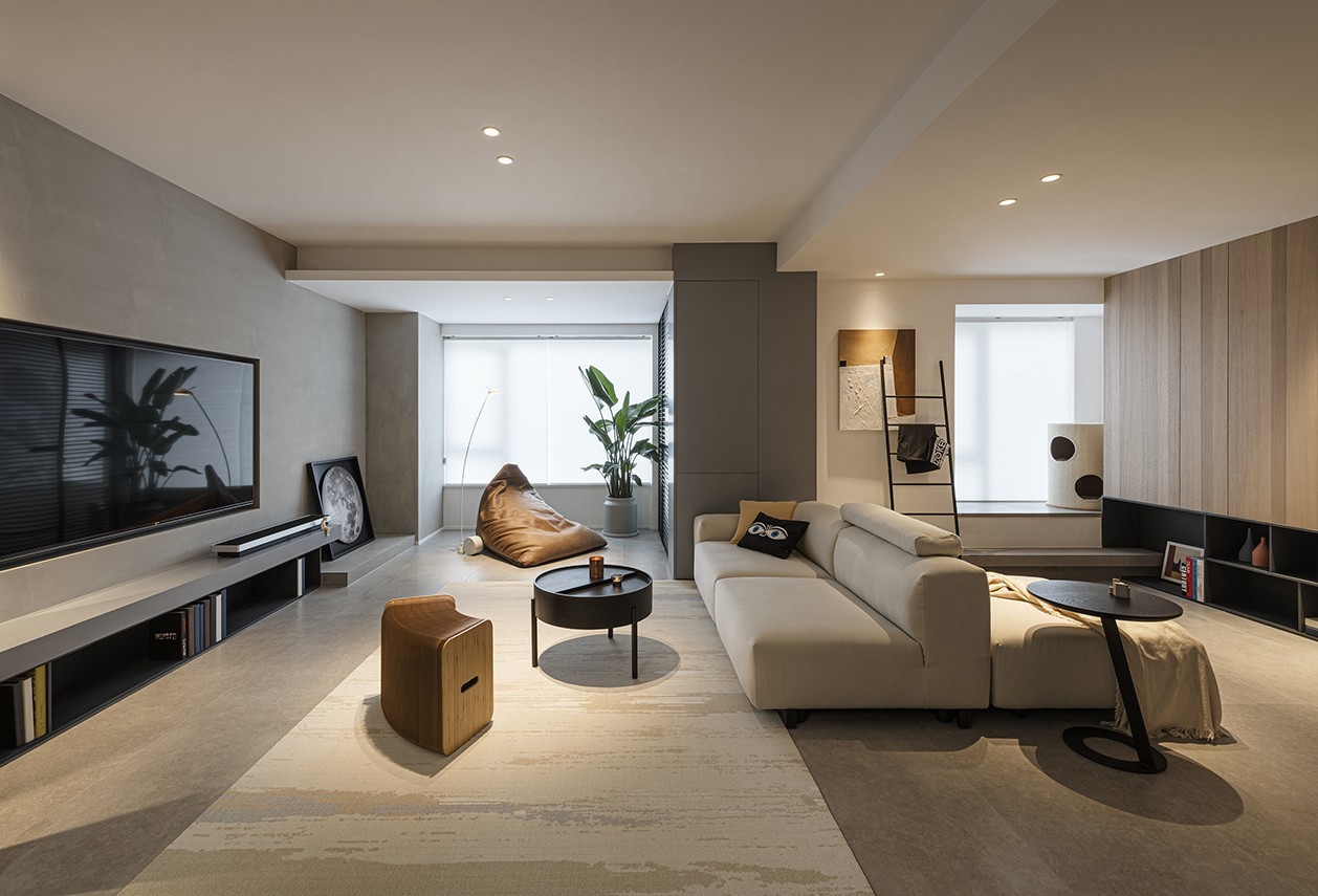 用干净的线条勾勒利落的量块造型,渲染整体风格的硬朗与质感,冷调和暗调作为永恒的主色,共同营造高知男性沉稳理性的空间表情;同时以原木饰面作装饰,配合柔软的沙发家具,辅以柔和的灯光烘托,围合出两人一猫的互动场域,营造平静且温馨的氛围感。