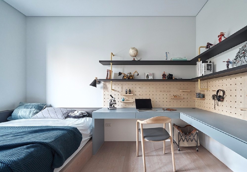 充分利用卧室户型的特点,紧贴环绕墙壁,墙上的置物架刚好又能满足家里小孩的玩具收纳。