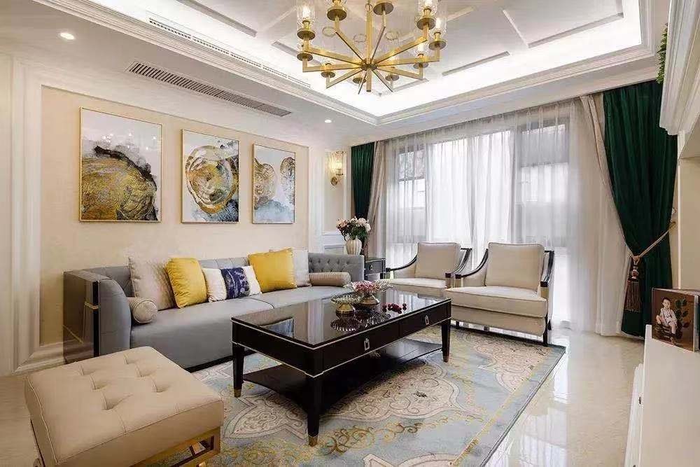客厅将轻奢元素与现代美式元素进行的巧妙结合,为了不让整体空间过于沉闷,在软装搭配上则会相对跳跃,孔雀绿的窗帘、柠檬黄的抱枕以及金属框的抽象艺术画,都很好的点缀了客厅,为空间增加了活力。