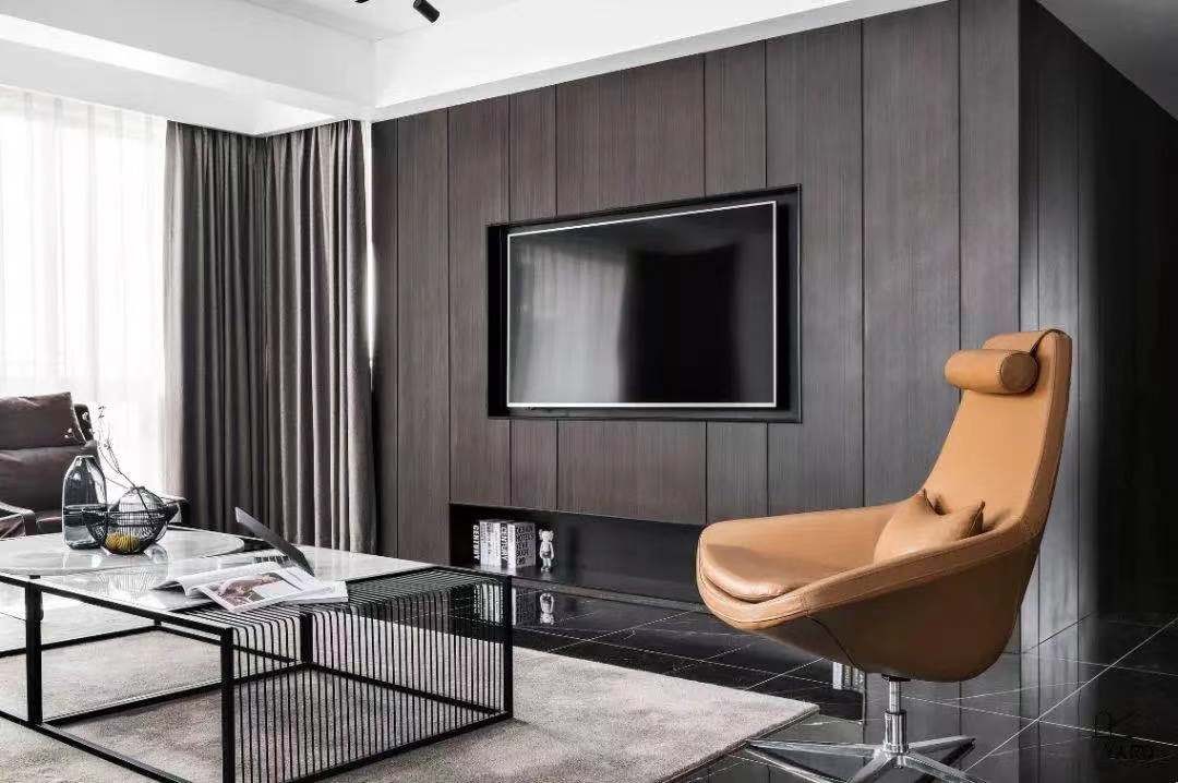米色的地毯的选择在一定程度上也缓和了黑色的冰冷。黄卡其色单人沙发,起到了不错的点缀效果。