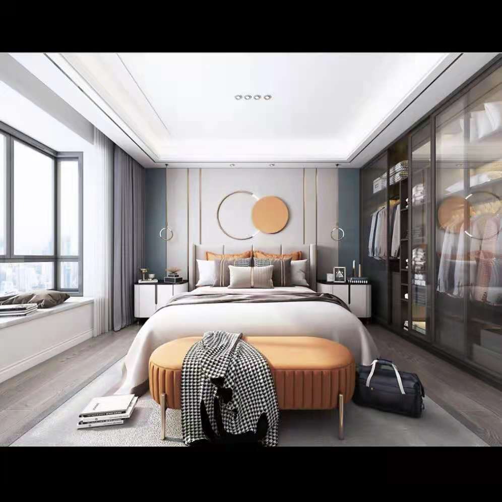 主卧床头墙是米色加蓝色的饰面板,中间挂一幅圆形装饰,布置上舒适端庄的床铺,白色与橙色的碰撞。