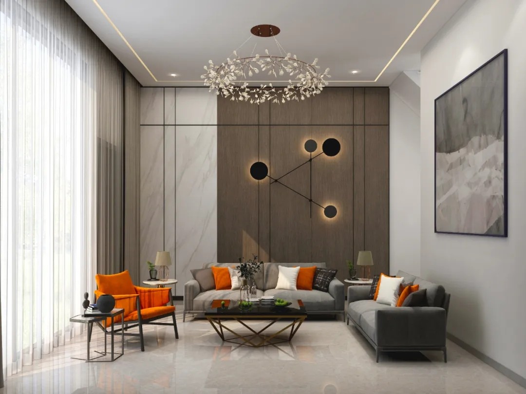 客厅采用了大量的简单线条结构,以***灰为空间主色调搭配原木棕家具,营造出一个稳重简约的***感。局部软装使用活泼的橘黄进行跳色搭配,为低调空间带来一丝活跃气息。