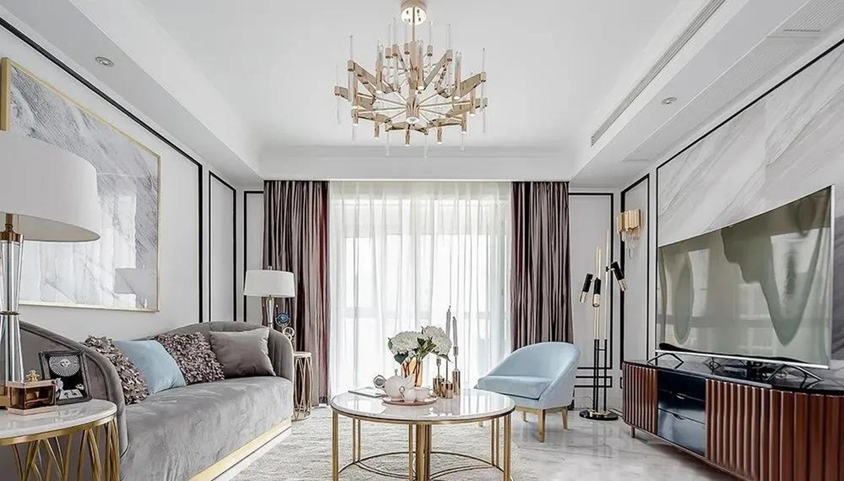 客厅以米杏色、黑白及“雾霾蓝”为主调,金属线条勾勒空间精致感。