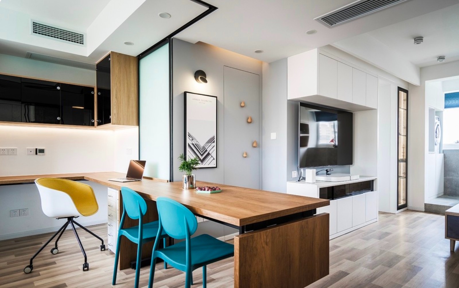 来一组餐桌变形记,餐桌旋转90度后,与次卧的书桌无缝衔接,形成超长工作台。此时,可旋转的电视就派上了大用场,实现了业主用餐时喜欢看电影的乐趣。