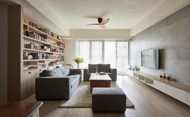 客厅整体的设计非常的整洁干净,没有杂乱之感,简直是强迫症的福音。客厅上方吊扇的设计,充满了年代趣味感。