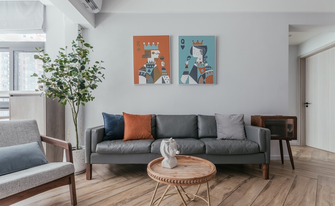 抱枕与挂画的橙色和蓝色相互呼应,点亮了本来较为沉闷的客厅~
