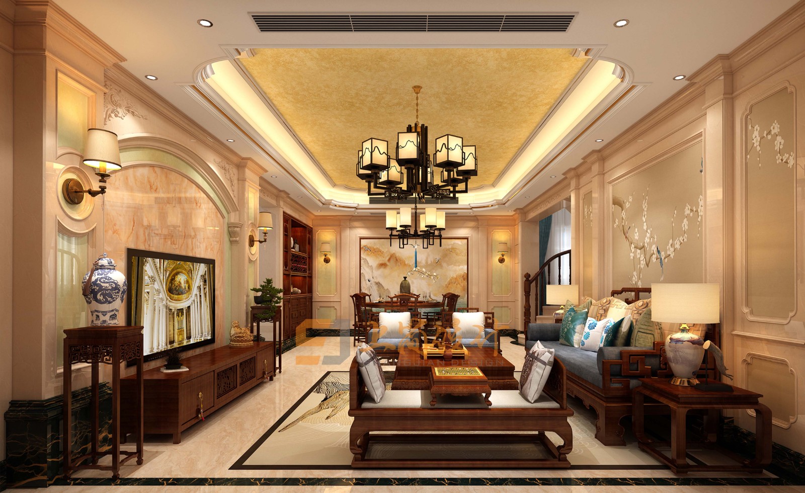 一楼客厅:家具是中式的,硬装也是以中式为主,欧式表现在天花板和墙体处,配合得非常合理。 沙发墙的背景色很有古典韵味,傲雪梅花开枝头,也能展现居住者心怀大义、傲立人群、勤劳朴实的人设印象。 沙发也是中式古典风格,客厅颜色相近,以暖色调为主,增加客厅公共聚集处的温馨度。客厅上方的淡色与客厅下方深色的家具摆放相互衬托,主次分明,大气磅礴。