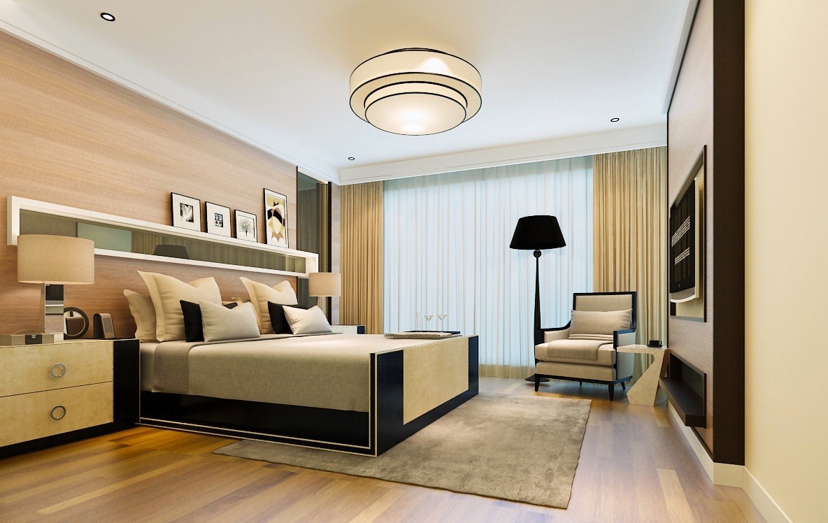 卧室,以温暖型灯光为主 卧室的色调选用偏中性一些。光源取代传统的主灯模式,营造更丰富的视觉效果