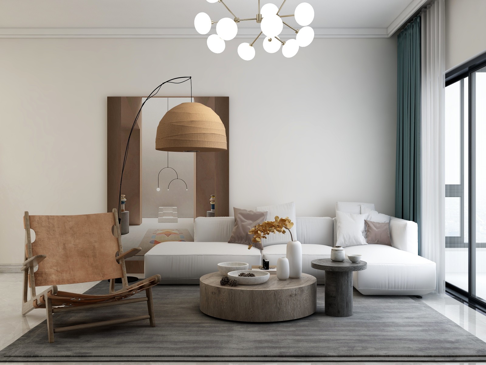 客厅地面延续暖色调,乳白色墙面漆,树林意境壁纸铺贴出沙发背景