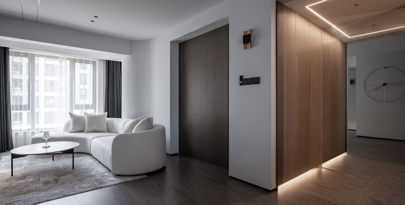 客厅阳台扩建到室内后,总落水管粗粝而突兀,设计师同样使用弧形结构对其进行表皮处理,最终和谐隐没,并与沙发线条形成形态上的呼应。顶面线性灯光贯穿客餐两厅,加强了两处空间的跨度感和整体感。