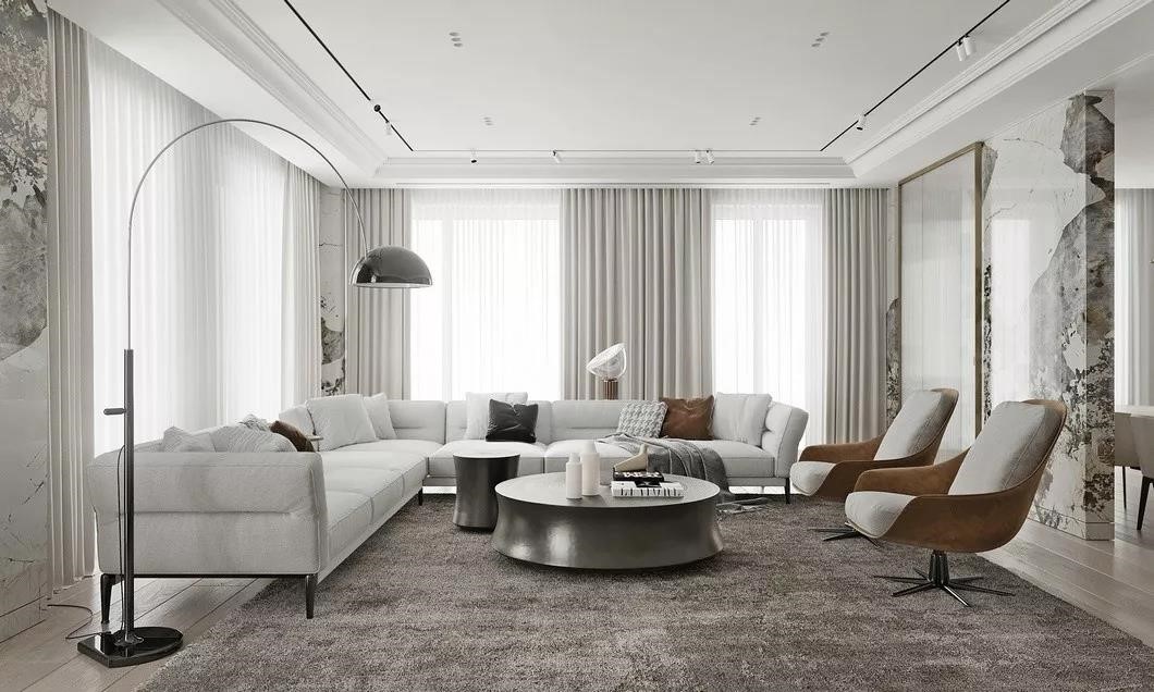 房子整体空间颜色非常简单,几乎全由低饱和度的颜色组成。客厅作为公共区域的中心位置,通过形体的摆放和材质的选择,形成一个非常温暖且舒适的交流互动区。颜色上***灰为肌低,予人冷静安逸的视觉感受,大面积白色的运用于精致的金属材质成为贯穿于空间中的艺术力量,轻盈的暖棕色装点其上,点亮空间的视觉。
