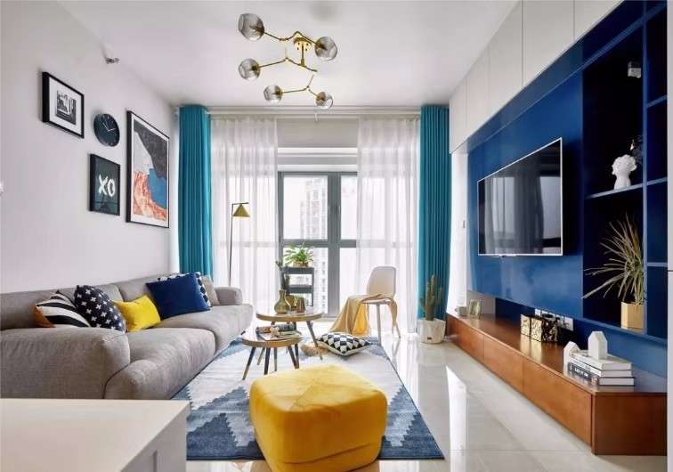客厅以白蓝两色为主色调,辅以柠檬黄及绿植进行点缀,整体清新又亮眼。深浅不一的蓝色形成了渐进的色彩层次感,作为背景色,与其它色彩搭配的融合度也很高。