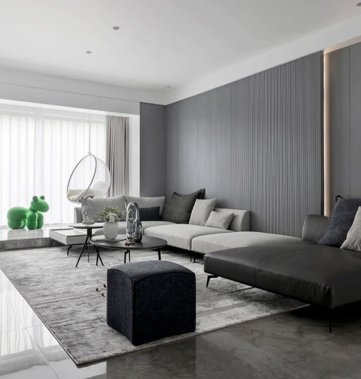 墙面的竖格栅肌理打破灰色墙面的枯燥乏味,为大面积灰色加入了肌理,让空间更具韵律感,增添趣味性。
