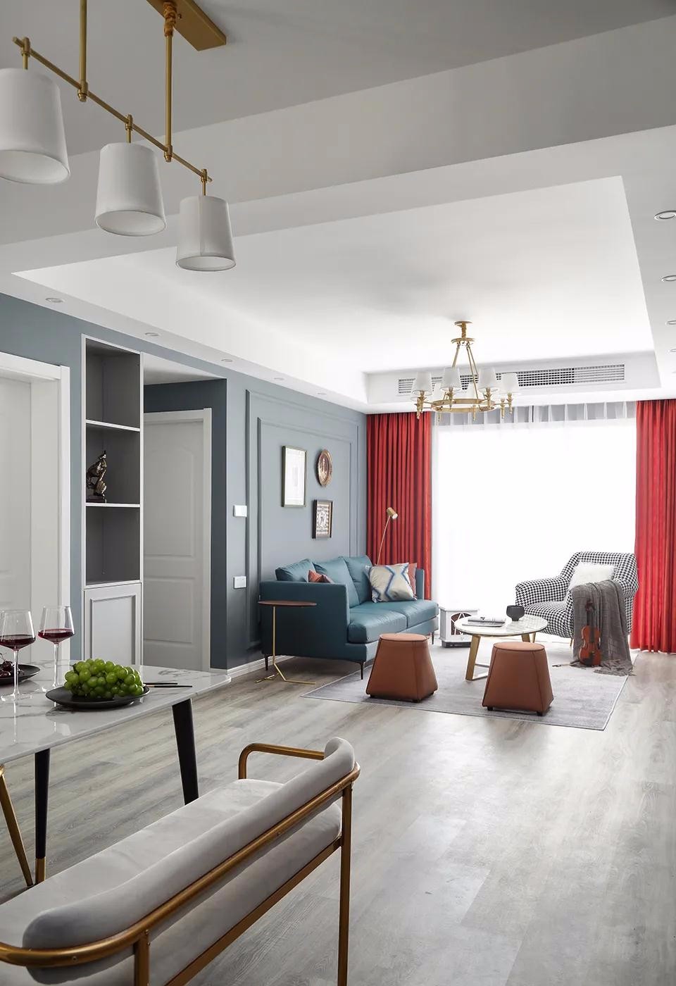 在这套仅有80平米的刚需户型中,整体空间以开放式的客餐厨设计,在小空间基础实现了较为宽敞的视觉氛围。而在整体风格上则是以现代与轻奢风的元素为主,通过大胆浮夸的配色,让这个刚需房也装出了优雅华丽的豪宅气质,实用大方、令人舒适。