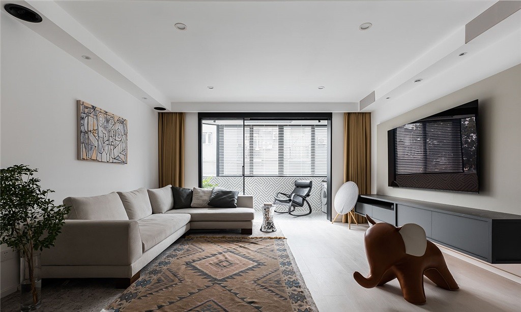 克制的用色基调下,选用柔软的绒面布艺沙发、复古做旧的叠铺地毯,利用材质的加持增添温暖氛围,在阳光的照射下仿佛为家镀上了一层名叫温暖的柔光滤镜。