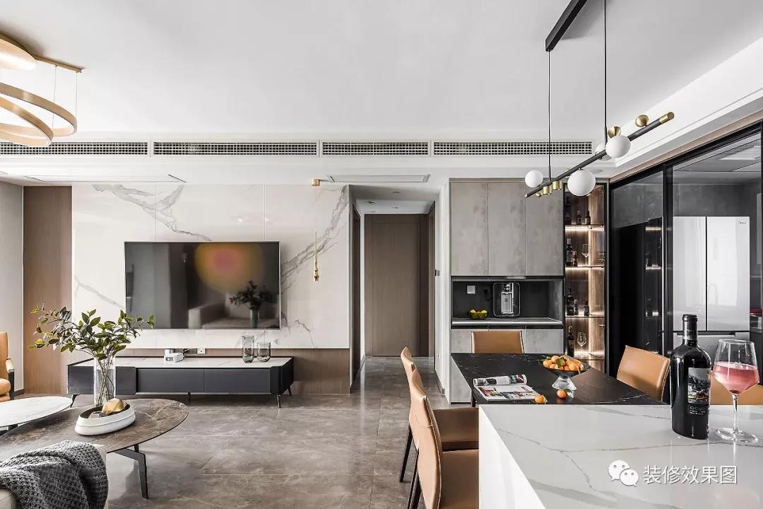 客厅,灰白两色为屋主营造简约的空间基调,大理石、木饰面、岩板、玻璃等材质的运用,突出极简现代的品质感。