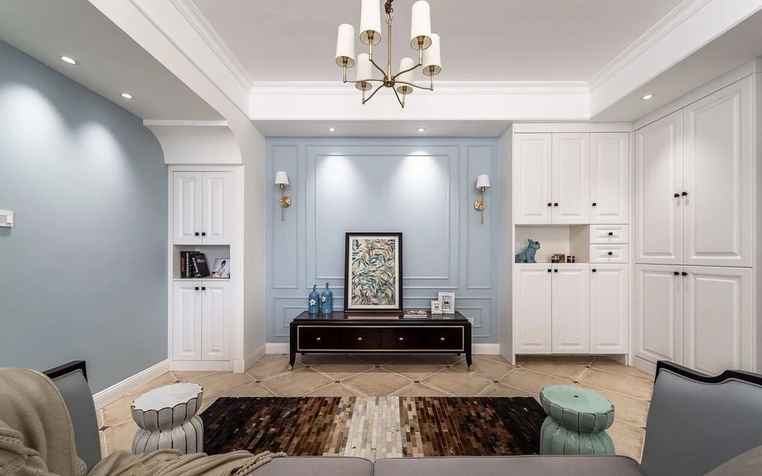 延梁设计的造型门廊,刷整面灰蓝色墙漆作为背景底色,在暖白灯光的照射下,呈现出温馨舒适的家居氛围。 (2)