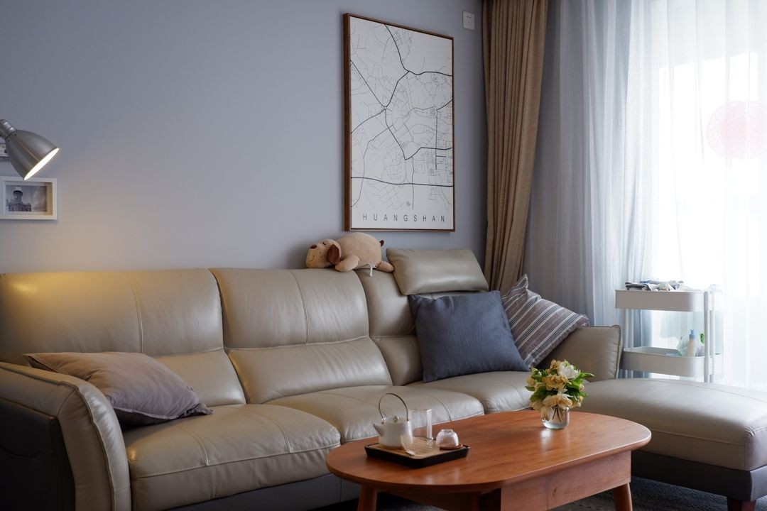 米黄色沙发,柔和的樱桃木电视柜、灰色系地毯,点缀黄铜元素抽屉,为大气的空间注入精致的气息。