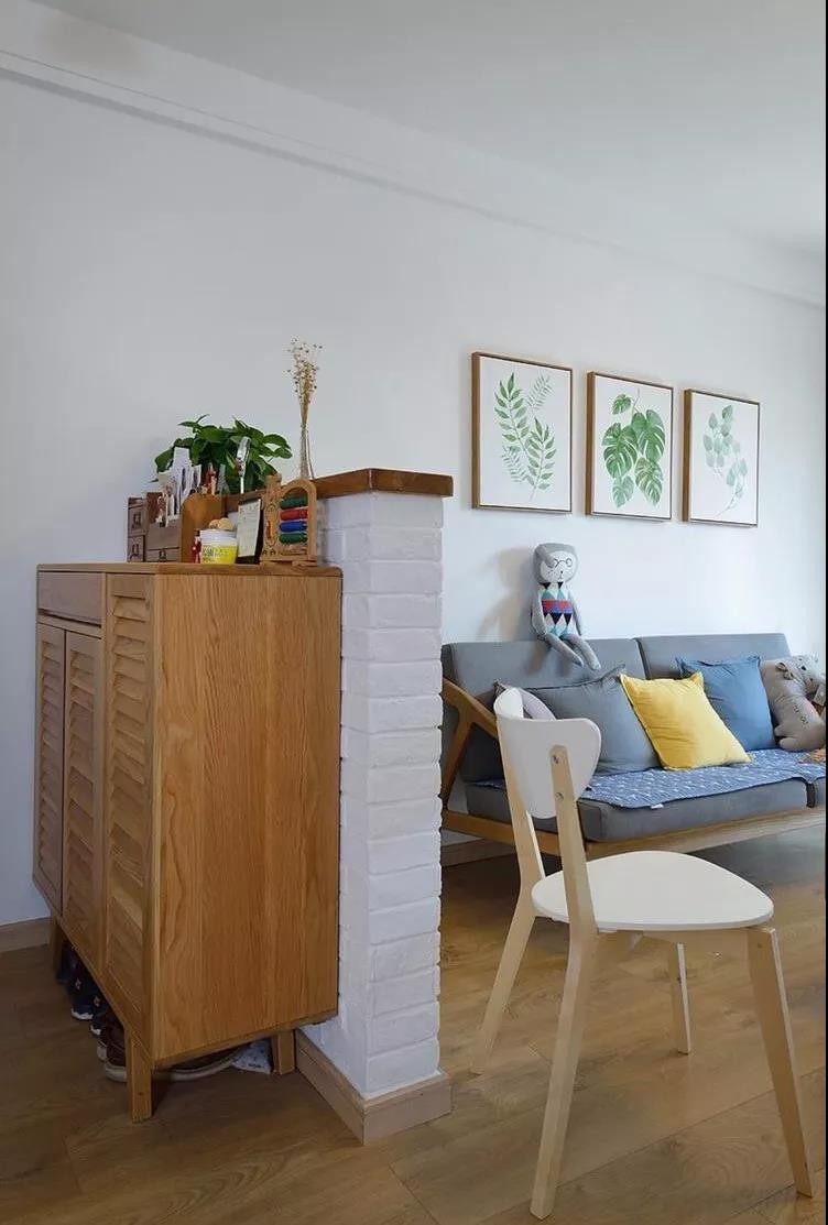 入户门直对阳台,在入户门和客厅之间做了个文化砖半墙隔断,可以摆下一个小鞋柜,又能避免风水问题。